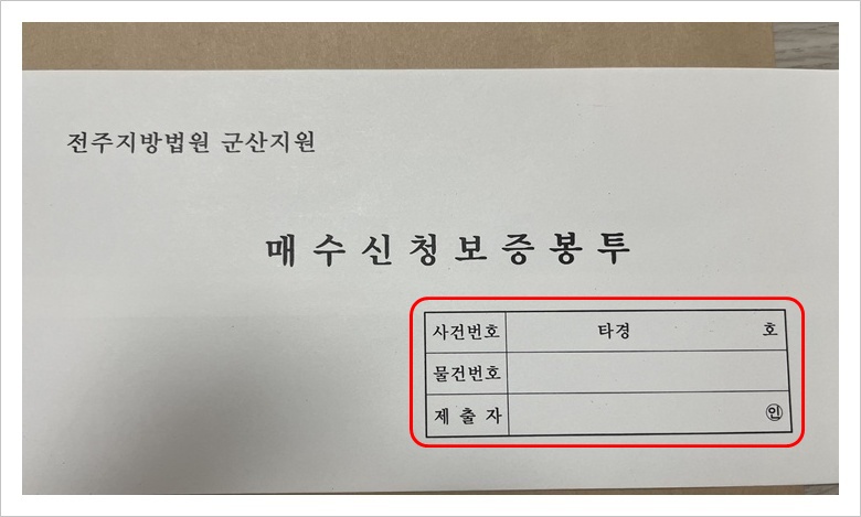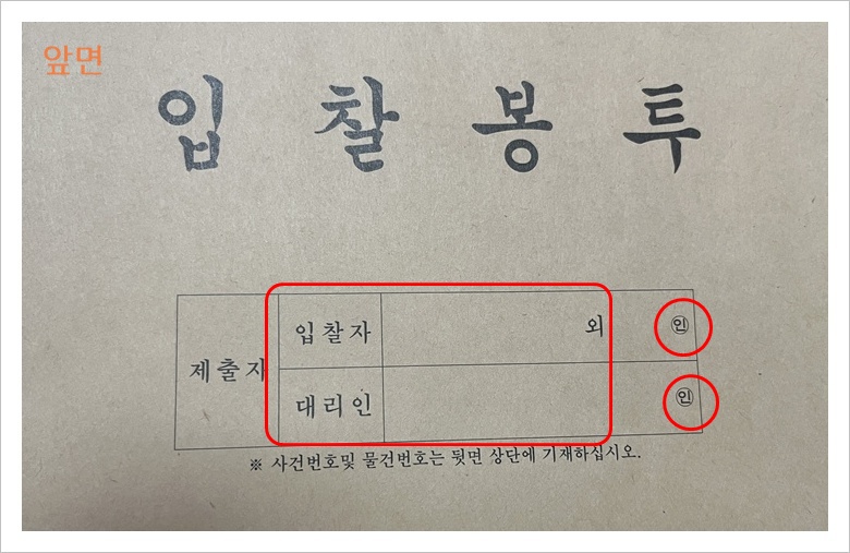 봉투를 열어서 윗면에 사건번호와 물건번호를 적은 다음에 입찰표와 보증금 봉투를 안에 넣어 주시고요