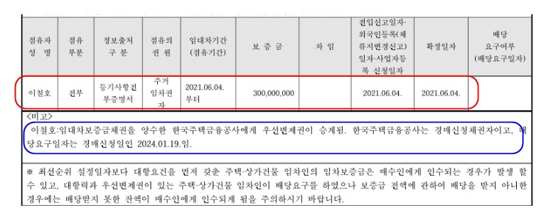 이철호라는 분이 2021년 6월 4일부터 3억이라는 보증금에 전세를 살고 있으며 2021년 6월 4일에 확정일자도 받았다는 내용입니다