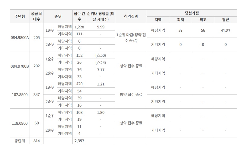 아이파크시티 2차는 평균 2.9:1의 경쟁률을 보였으며 84A가 5.99:1로 가장 높았고 84B가 0.88:1로 가장 낮았습니다